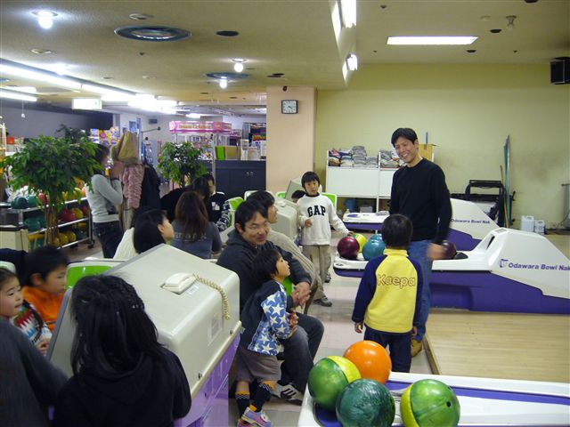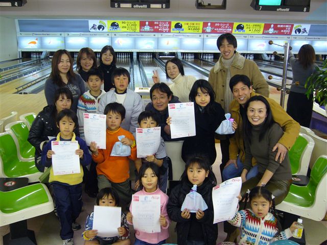 小さな生徒さんたちは自分の頭よりも大きなボールを抱えてボールがまっすぐに転がるように真剣な眼差しで頑張っていました。お父さんお母さんもゲームが進むにつれ徐々に体がほぐれてきた様子でストライクやスペアの連発!!
