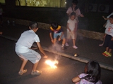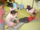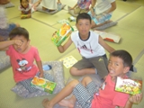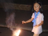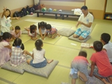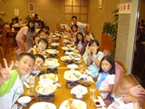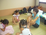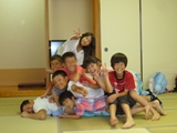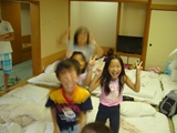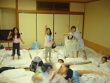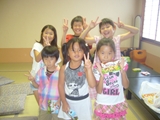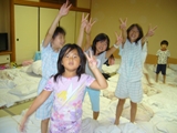 初日、あいにくの雨でプールに入れず、お部屋でまず英語で自己紹介をした後、ゲームをしたり、大浴場の温泉にゆっくり浸かりました。夕食後は雨も上がり全員で花火。夜は翌日に備えて早めに就寝するはずでしたが、お友達と一緒の夜に大半の子は興奮してなかなか眠れず、また翌日は大半の子が早く目覚めてしまいました。